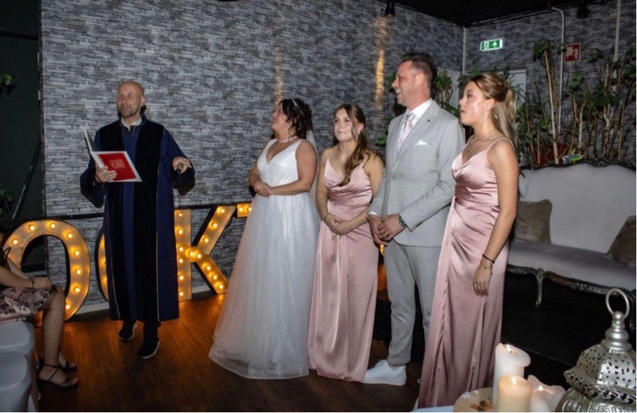 Tijdens deze bijzondere dag spraken wij opnieuw onze trouwgeloftes uit. Robert verzorgde de ceremonie en deed dat op zijn geheel eigen wijze: ludiek, met humor, met emotie en bovenal met enorm veel liefde. Hij wist iedereen te raken en tegelijkertijd te laten lachen. Het voelde persoonlijk, oprecht en precies zoals wij het voor ogen hadden – misschien zelfs nog mooier.